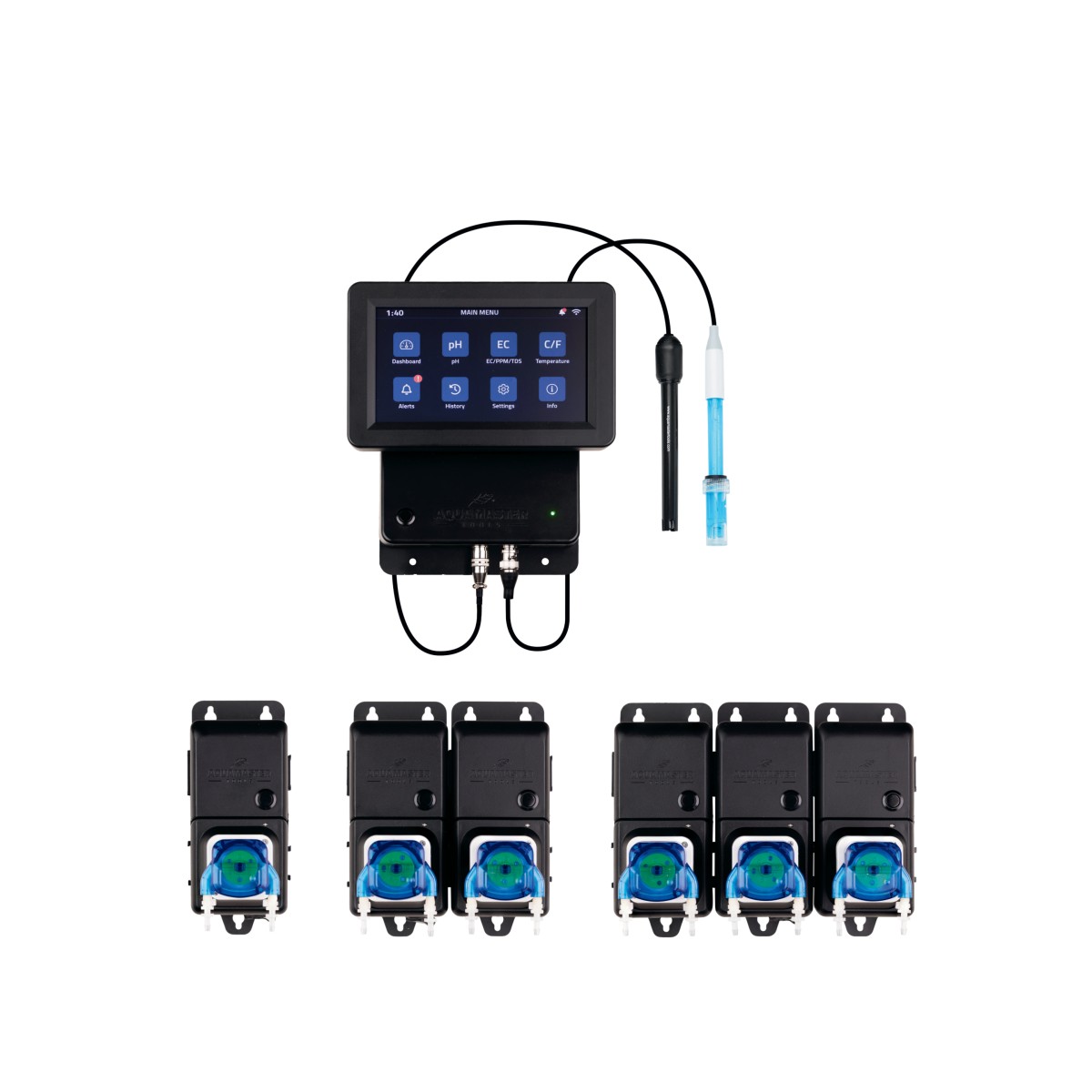 Le kit C800 Pro Ultimate représente la configuration la plus avancée du système C800. Le contrôleur surveille en permanence le pH, l'EC, le PPM, le TDS et la température. Lorsqu'une correction est nécessaire, le système régule automatiquement le pH et dose indépendamment cinq composants nutritifs. Cette configuration utilise la capacité de dosage maximale du contrôleur et est idéale pour les opérations de culture complexes ou commerciales.